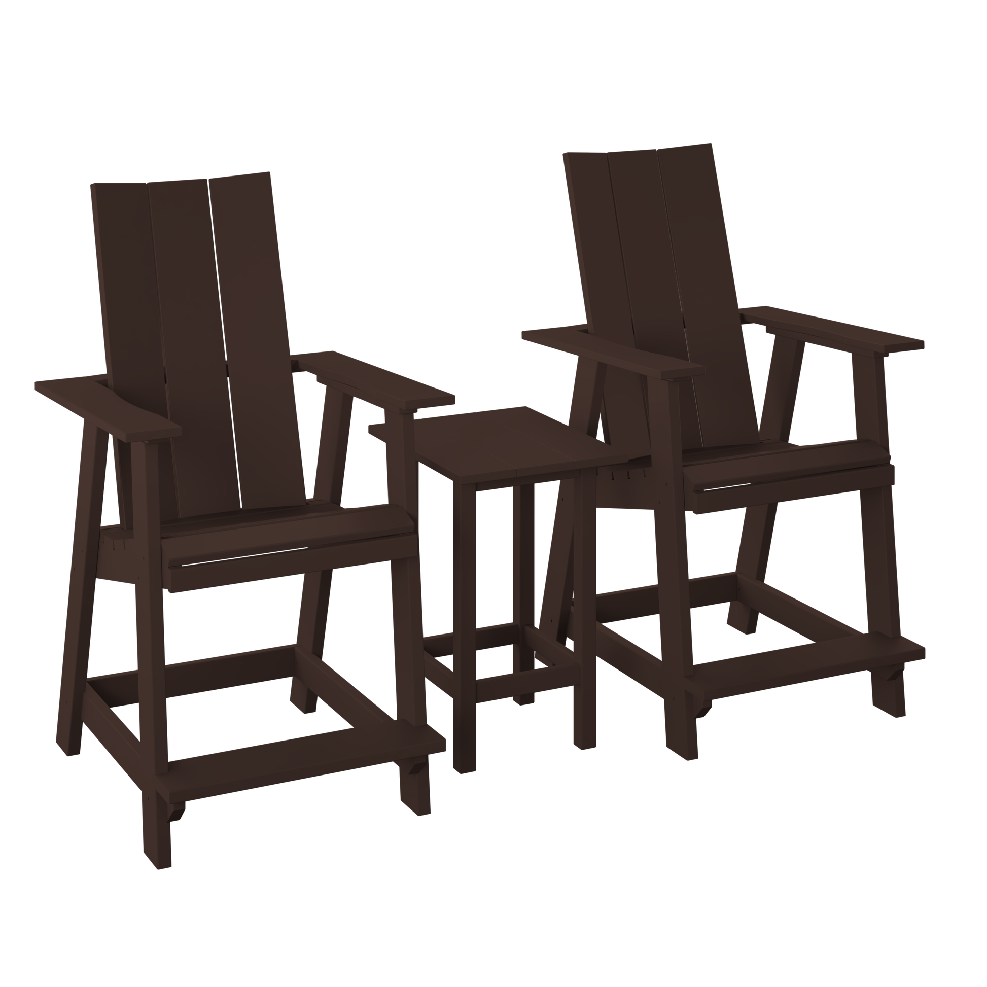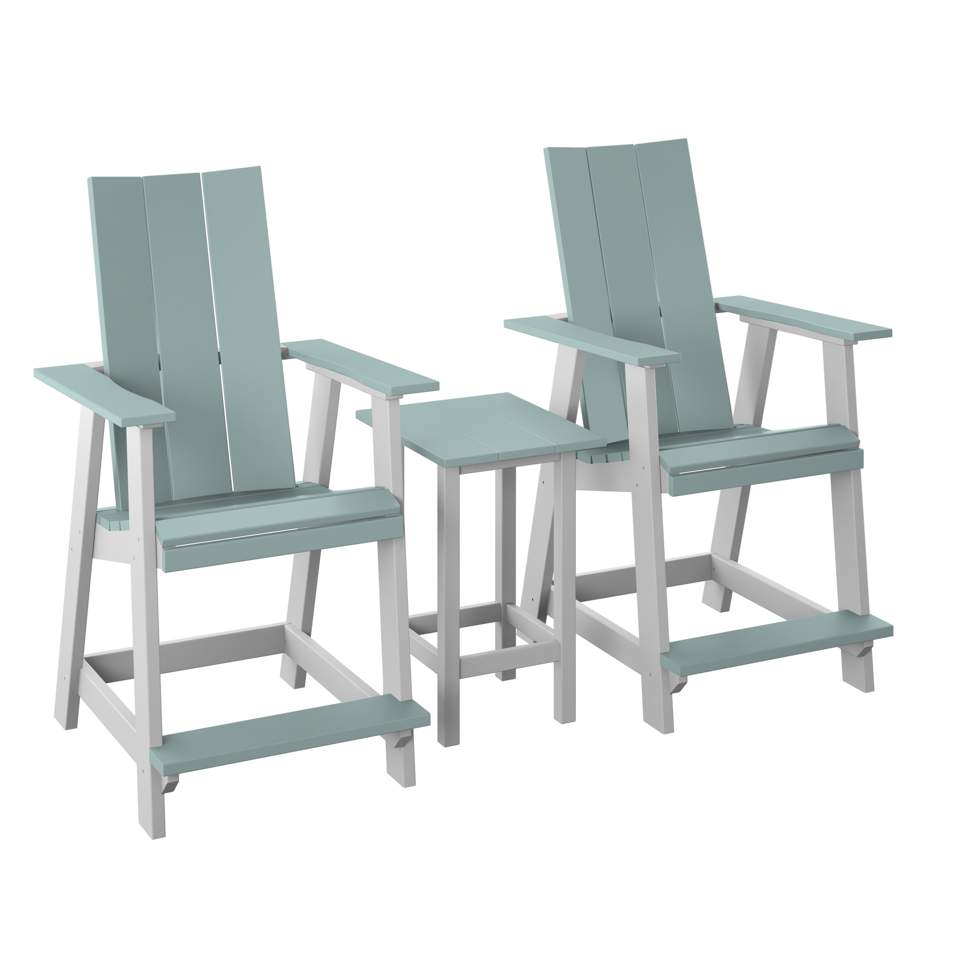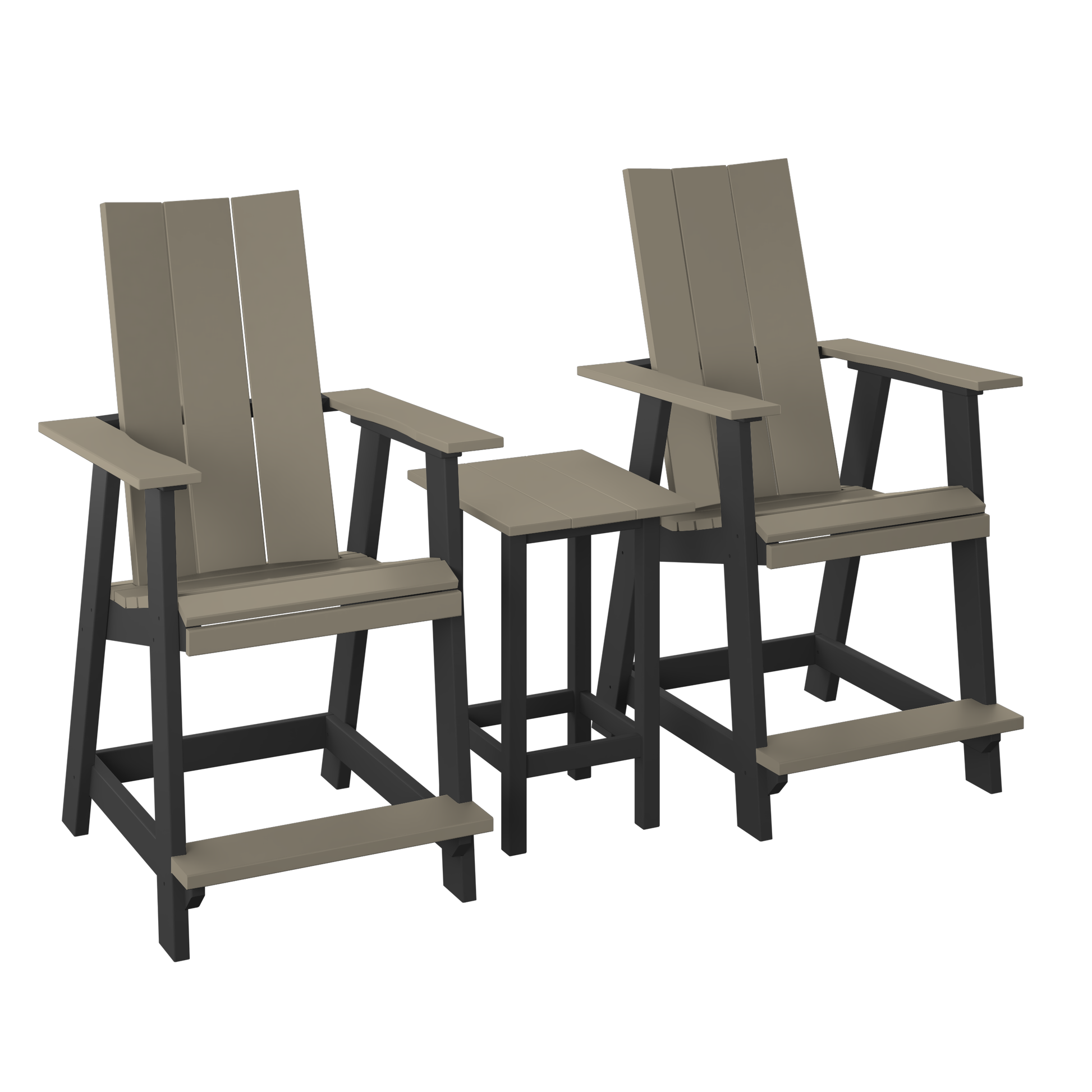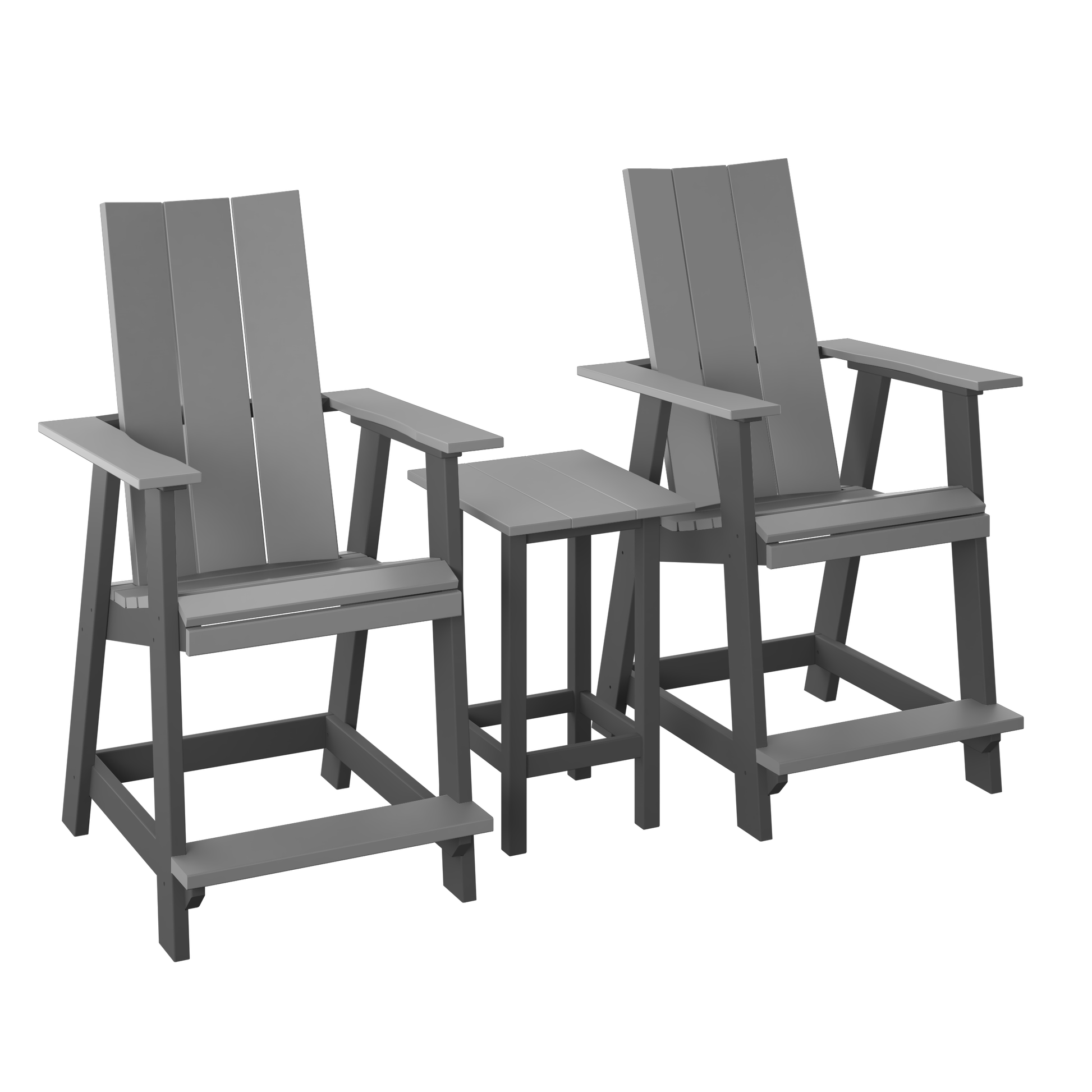 A clean, modern two-seat set built around taller Adirondack-style chairs with a matching raised end table for drinks and snacks. A great way to set up a tidy conversation spot with a higher seat and a streamlined look.