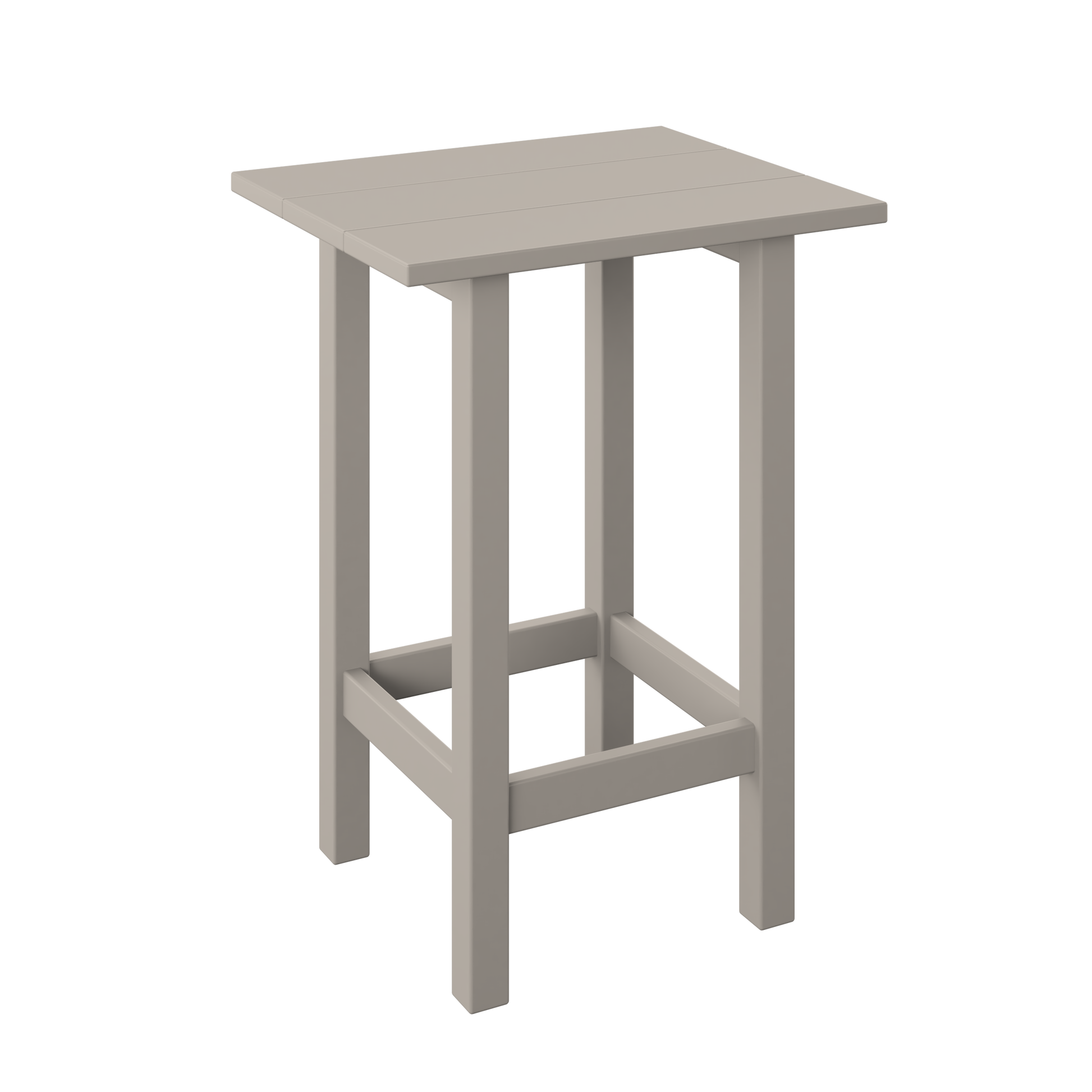 A modern raised end table designed to sit at the right height beside bar seating, offering a clean, convenient surface for drinks, snacks, and small plates.