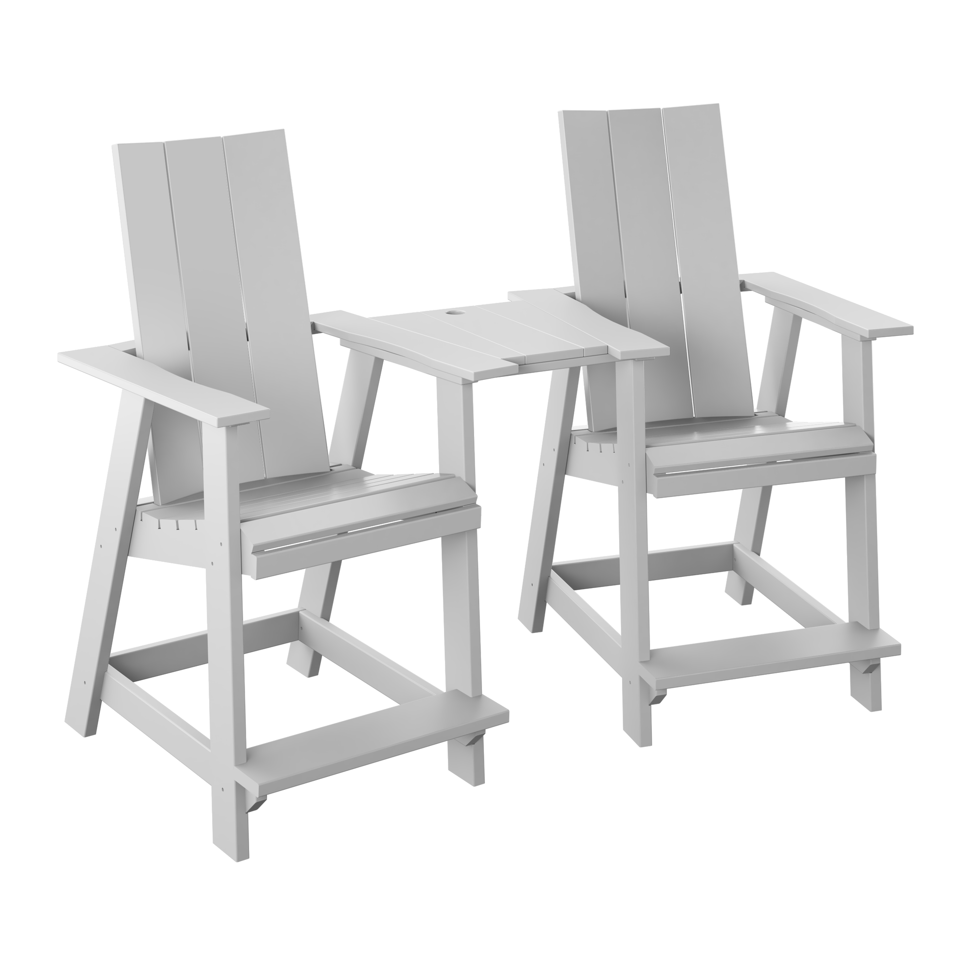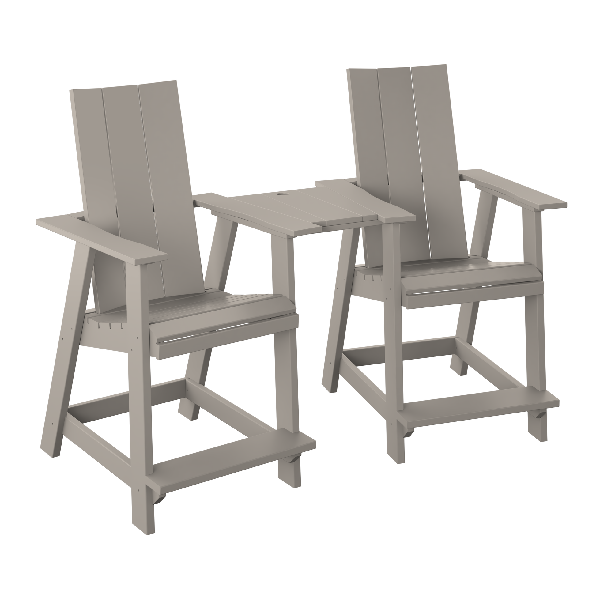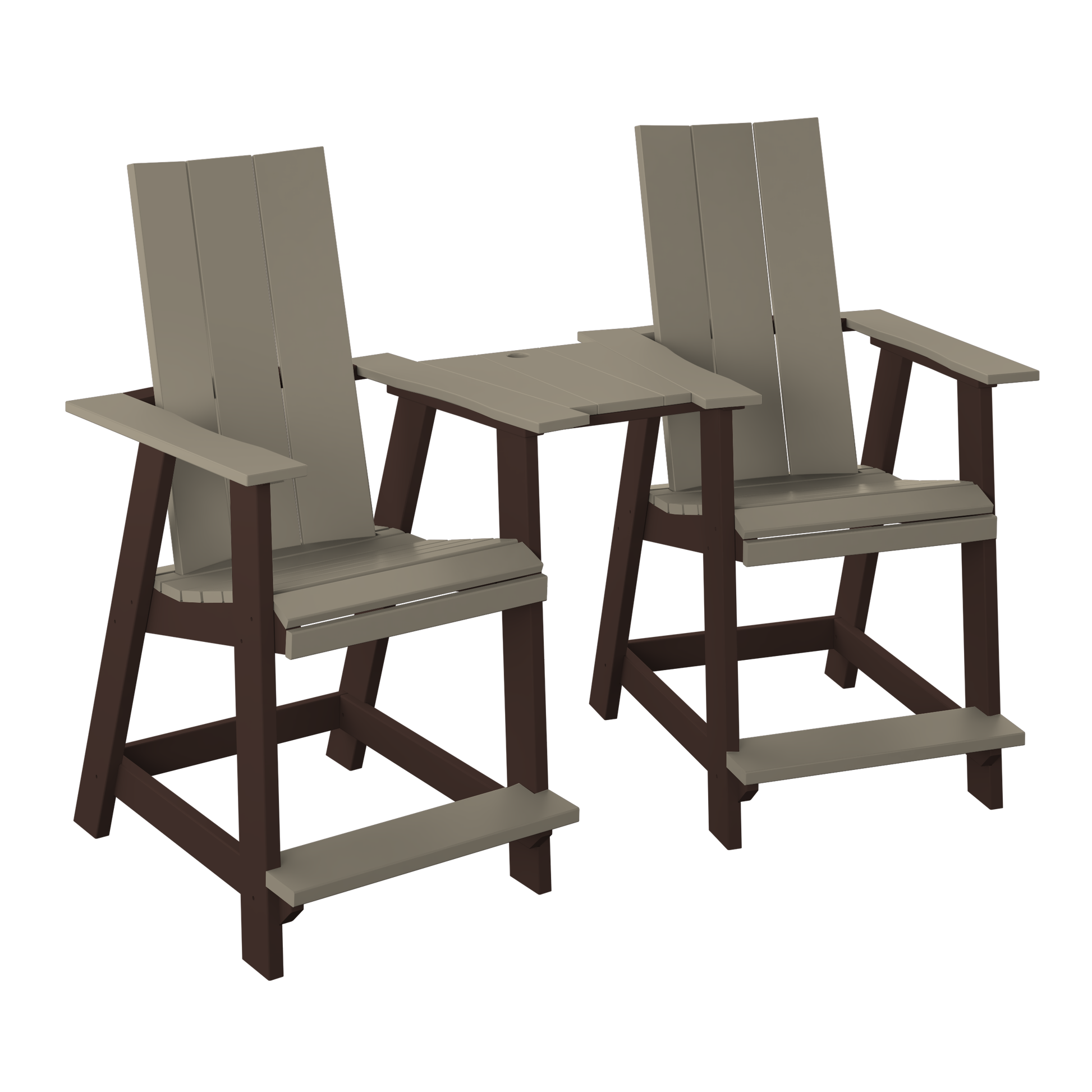 A modern counter-height tete-a-tete set that pairs two elevated seats with a shared center table, creating an easy, space-smart spot for drinks, snacks, and conversation. The center table has a spot for an umbrella when you want extra shade.