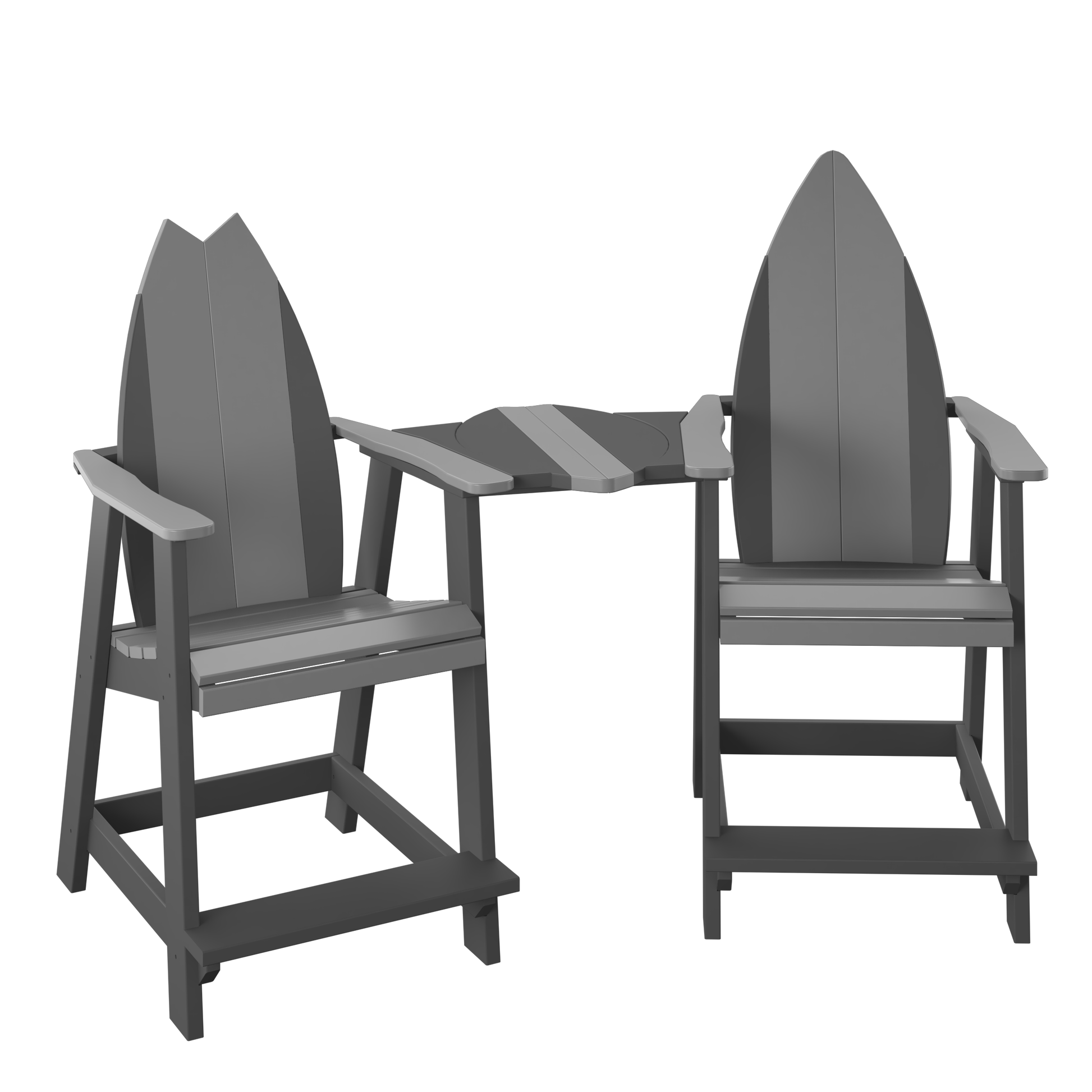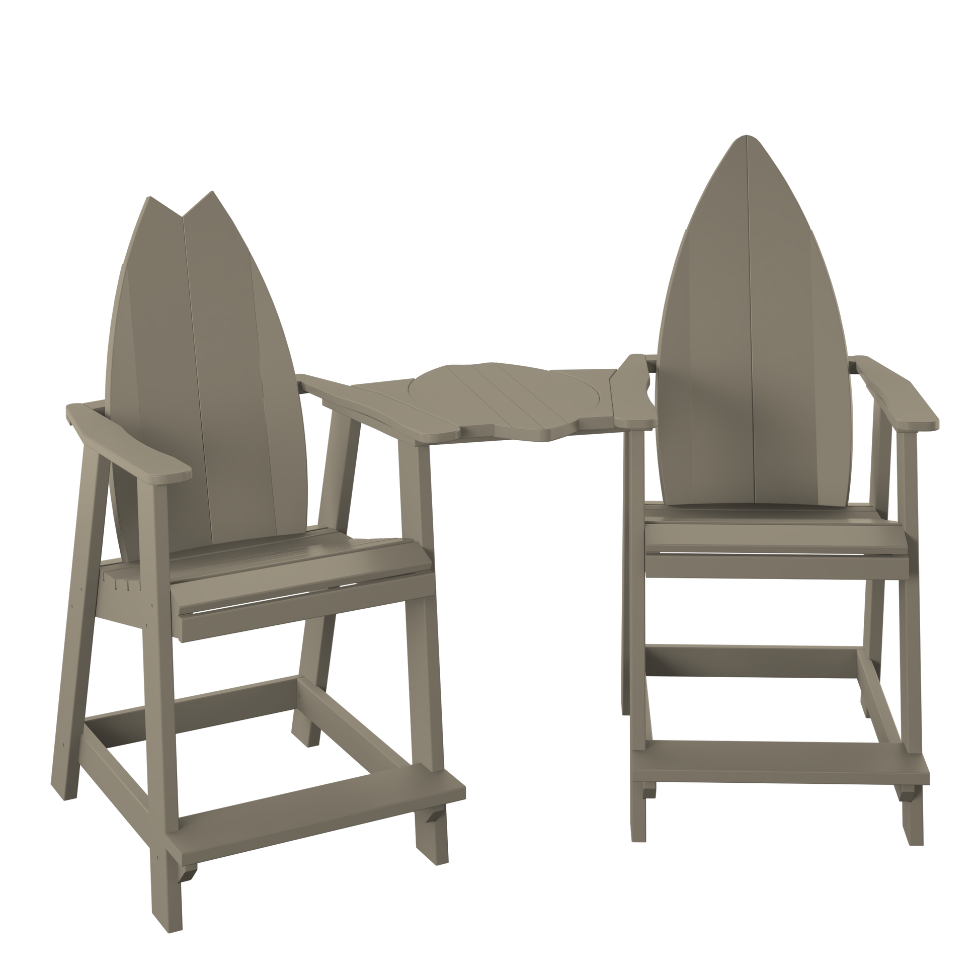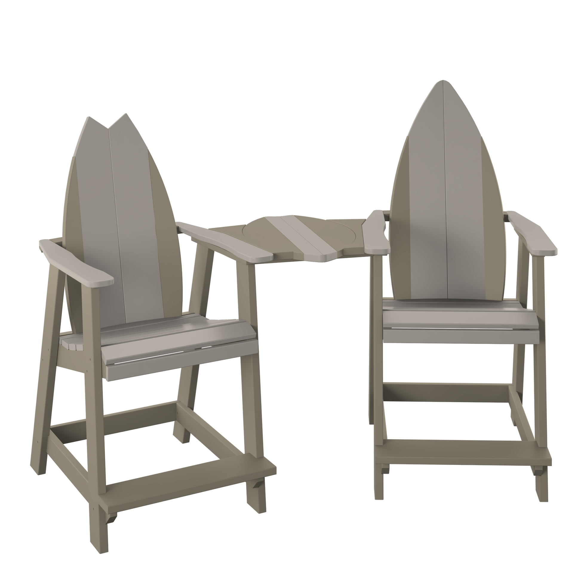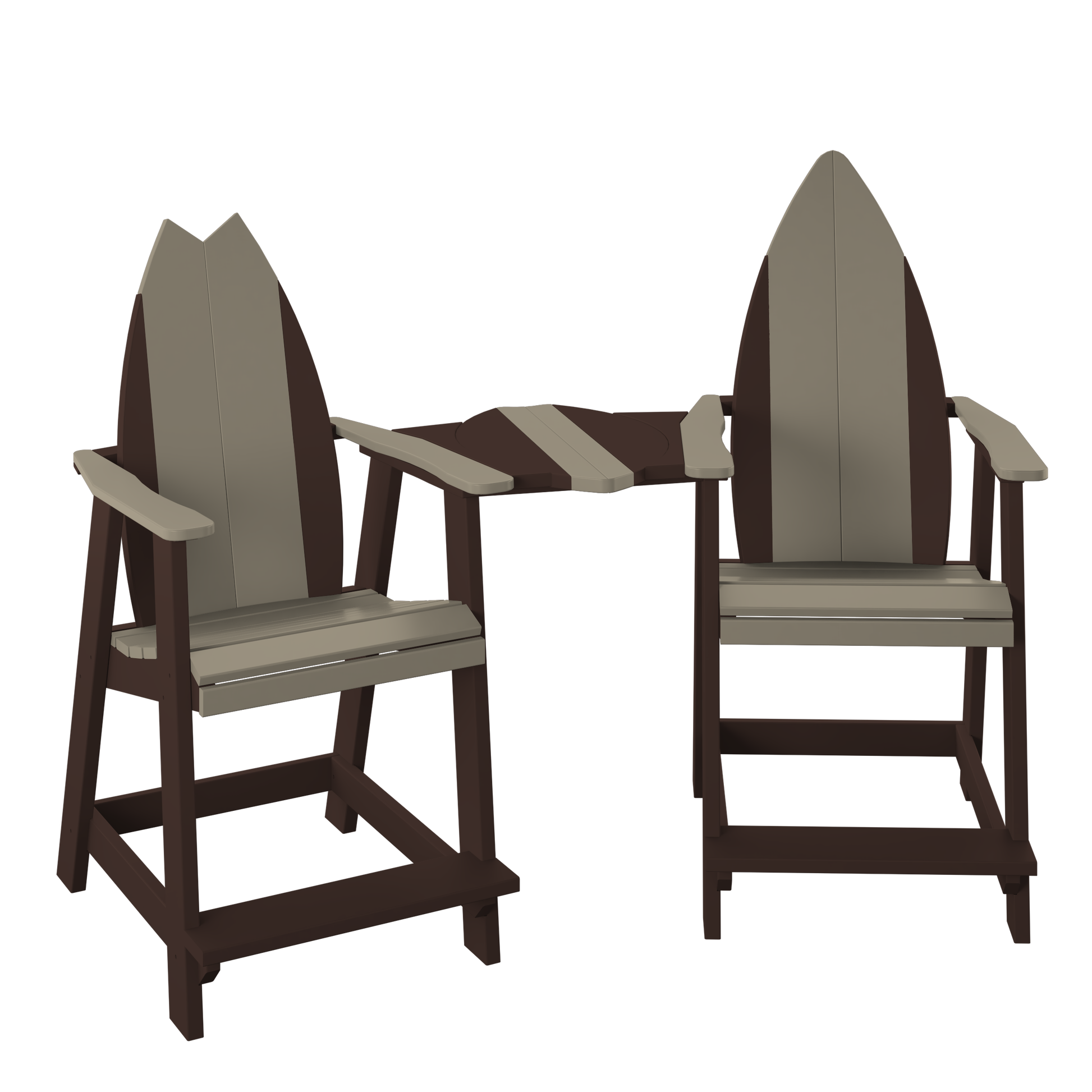 A surf-inspired tete-a-tete set that brings two counter-height seats together with a shared center table, making it an easy favorite for coffee, cocktails, and conversation.